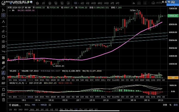 大饼昨日白盘震荡后再次上行突破前高至71150一线受阻回落,低位跌至69300一线止跌反弹,恭喜跟上思路的朋友多单获利一千点,目前币价在70400附近运行,四小时级别行情呈高位震荡走势,区间在69000-71500,macd多头逐步缩量有死叉迹象,短期反弹力度不强,关注能否站稳ma7上方,否则还会回踩试探下方支撑,预计回踩力度不会大,日线收在了7w上方 且二次回踩形成下影,走势来看偏向多头,延续上行的概率较大,预计这两天将会冲击新高,思路不变低多为主高空为辅,上方压制71500-73500,下方支撑70000-69000