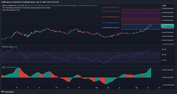 在这种情况下,预计WEN的价格可能会回调。如果价格下跌,代币的价值可能会回落至 0.00037 美元(0.786 斐波那契回撤位)。