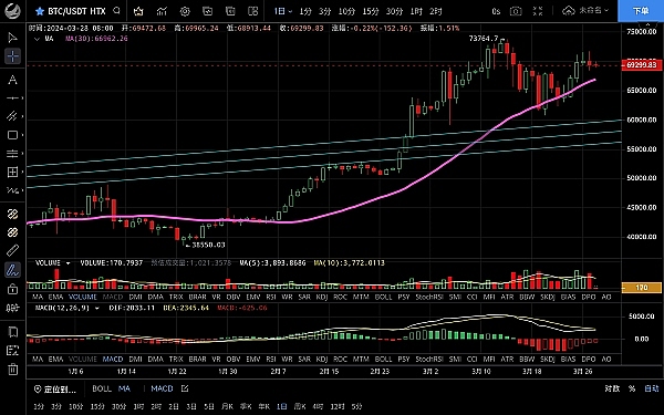 大饼昨日白盘波动不大,晚间上下插针冲高至71700一线又迅速回落,低位跌至68430一线支撑,目前币价在69150附近运行,四小时级别形成短期顶背离结构走出回落,下方关注ma120均线支撑,macd空头运行双线死叉向下,短期暂时止跌反弹但力度较弱,关注上方ma14均线压制,不站稳还是有下行的风险,日线来看k线收阴,上涨动能减弱陷入高位横盘,下方空间不会太大,长期来说涨势没发生改变,预计震荡后还是会继续向上,空单的话还是需要谨慎,建议低吸为主,上方压制70000-71500,下方支撑68400-67000