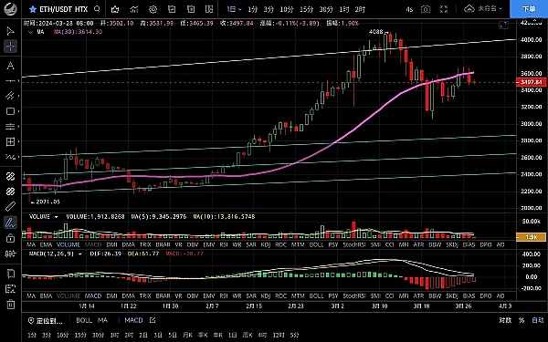 以太坊走势与大饼一致,昨日晚间行情插针至3665一线未破前高迅速回落,跌至3460附近一线支撑反弹,目前币价在3475附近运行,短期来看行情反弹较弱再次下行有试探前低的风险,跌破的概率较大,预计会在3450支撑走出小型反弹,四小时级别上方承压明显,k线收长上影阴线,回踩力度较大,但没破区间,短期多空拉锯,只要四小时收线在3450上方则回踩结束,否则还是会继续下行,日线级别上涨乏力走出回踩,整体还在震荡区间守住3400的话还是有很大希望上攻3680阻力的,短线可以高空低多操作快进快出,长线还是低多,上方压制3560-3620,下方支撑3450-3400