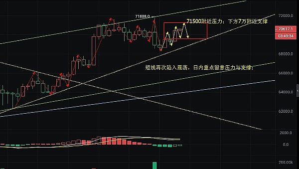 短线级别4小时收窄,本时段中阳收于中轨与均线上方,且均线胶着,有望进一步形成金叉,布林带受昨天冲高回落达到了收口变窄的现象,所以对于今天而言短线级别暂时在布林带以内震荡为主,待结束这个震荡区间打开布林带才是新一轮行情的正式开始,密切留意吧。留意71500,及72000压力,下方留意7万,及69800支撑,维持主低多,待压力出现信号再空;