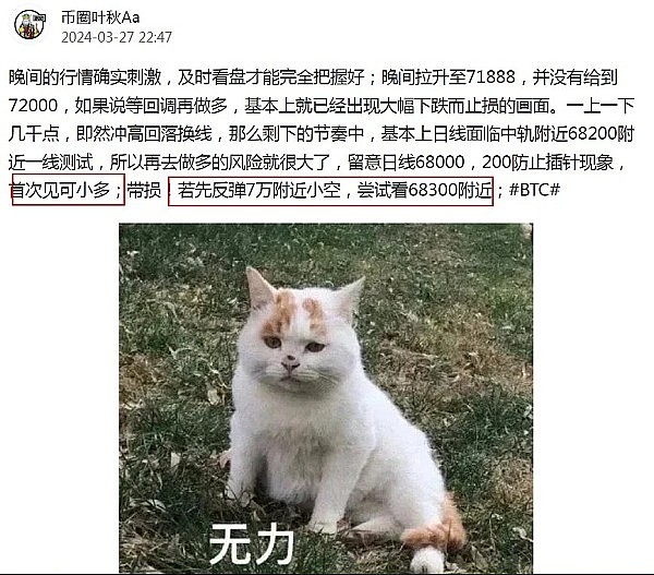 回顾昨天的走势,亚欧盘震荡下探69500后展开反弹,晚间拉升突破布林带71000,并延续刷高至71800上方承压,近两天我基本上多次说过关于压力72000一线,基于技术面形态,也符合技术形态。有兴趣的老板可以复核前面的分享。对于D点的做空位子而言,成功的概率是很高的。及时的盘面所展现出来的信号才是做空的依据,结合技术形态来作为判断依据,比较完美,过程是艰辛的,上窜下跳来回宽幅震仓,大多数人是被洗出去了,所以右侧做单对于昨天来说比较适合。突破上轨做多,但遗憾是没有给到72000,直接调头向下,随后反弹7万附近做空至68200附近,且反手于日线均线附近做多,均得到相对应的空间。