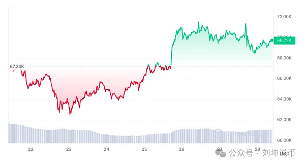 当前比特币价格为 69,712.16 美元,在过去 24 小时内下跌了 1.05%。过去一周,该币的价值就像坐过山车一样,小幅增长了 2.3%。