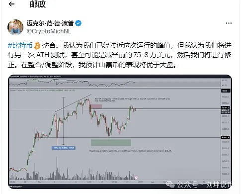 另一位分析师Michaël van de Poppe在推文中指出,比特币目前处于盘整阶段,这意味着其价格稳定或横盘整理。他认为比特币可能正在接近当前上涨趋势的最高点。然而,他预测,在重大调整发生之前,比特币可能会再次测试其历史高点,可能在下一次减半事件之前达到 75,000 美元至 80,000 美元的价格区间。