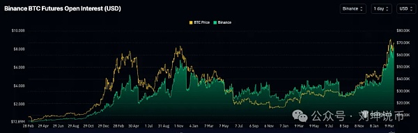 CoinGlass数据显示,比特币的未平仓合约已达到378.1亿美元的历史新高,高于3月1日的260亿美元。未平仓合约的上升表明市场参与度和对比特币期货合约的兴趣上升。当未平仓合约达到历史新高时,通常表明交易活动水平较高,并可能表明市场信心增强或对未来价格走势的猜测增加。短时间内从 260 亿美元跃升至 378.1 亿美元意味着交易活动增加以及投资者看涨情绪可能增强。