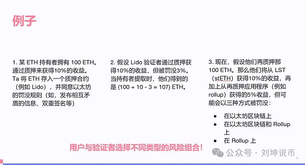 当持有者撤回时,他们获得 107 ETH。如果他们重新质押 100 ETH,他们不仅从质押 ETH 获得 10% 的收益,还可以从再质押应用中获得额外 5% 的收益。然而,与此同时,他们也面临着新的风险。现在,罚没事件呈现出一种树状的结构,有三种可能性。比如,人们可能在 Layer 1、rollup、Layer 1 和 rollup 上被罚没。这表明用户和验证器正在选择不同的风险路径。与过去只有一组固定的 L1 罚没事件相比,现在的状态空间扩展了,用户需要对风险有新的认识。