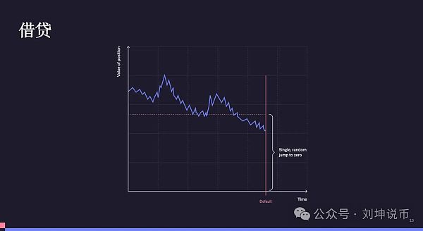 在链上借贷中,违约是一种指示函数跳跃至零的样式,你有一个头寸的价值,它低于某个清算阈值,然后跳跃至零。但这种跳跃是单一的,并且是一个随机时间,所以它是一个根据实际过程而定的随机停止时间,一次归零。