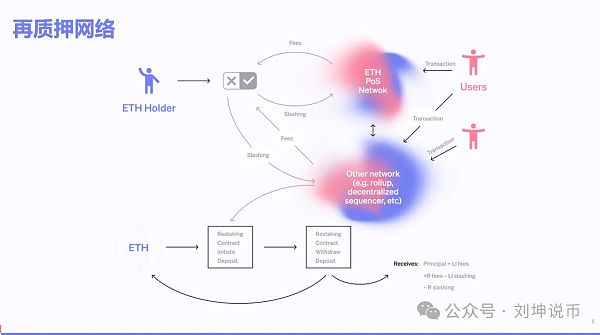 通过引入再质押,我们有了这些新的网络,如 MEV 拍卖和 FHE(Fully Homomorphic Encryption)。它们在处理手续费时引入了新的罚没环节。这些环节由再质押委托合约触发,该合约将资金存入质押合约。在再质押过程中,ETH 持有者的收益是本金加上 L1 手续费和再质押手续费,再减去任何 L1 和再质押的违规罚没。