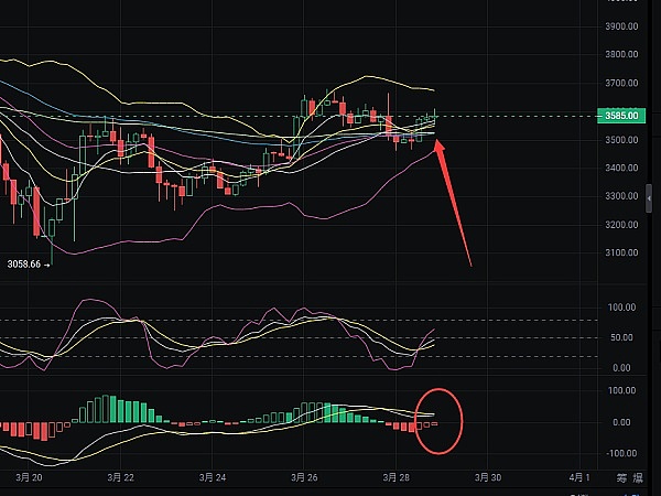 以太坊在昨日前日文章中都写到币价会有下调空间,昨白日在下方3545-3510区间不破做了一波多单止盈后关注到上方3675-3695区间不能破位,形成了一根大影线,币价迅速反向大滑水,在今凌晨触及3461位置后形成地位震荡,午间再次触及3465位置后形成单边上涨趋势,晚间美股开盘时间一举拉伸到3602附近;当前1小时线来看布林带通道拐头向上,币价处于EMA7支撑,KDJ继续维持超买现象,MACD持续放量;从指标上来看短时间还会有上升空间;4小时线来看,布林带呈收口状态,EMA7向上穿过EMA15;KDJ正在向上接近超买区间;MACD持续缩量接近向上0轴,DIF拐头向上接近DEA有望形成金叉;日线级别来看从3月12号到今日EMA15从上方下行穿过EMA15接近EMA30后再次向上即将接近EMA15,一旦再次实现向上穿越,那么币价将迎来一个大爆发!行情也不会一直只涨不跌,可以结合实时盘面在关键点位入场;综合上述指标来上方继续关注3675-3690区间破位情况,破位还是关注3720;下方可关注3550-3540;3525--3510这两个区间;行情瞬息万变,建议仅供参考,请自行把握风控!
