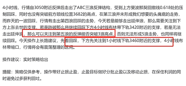 昨天长路在文中就有提到过,行情有回踩的走势,下方可继续关注3460的支撑,如果走不出4浪回踩的延伸浪,那么将会形成第五浪反弹,但是形成五浪反弹走势的条件是需要突破第四浪的高点,实时策略中也给出了再3500附近进场多单的策略,跟上操作的朋友多单可以拿下一波利润。