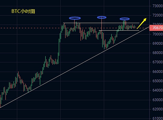 目前来看,这场博弈中还未分胜负,日线昨日再度转阳,并且难得企稳70000关口上方,短线构筑的上行趋势线维持良好,那么日内我们有理由继续去看涨,不得不承认周三的下跌的确扰乱了我们的思路判断;短线来看71200目前依然是小时线难以逾越的门槛,昨晚突破后回调,好在幅度不大,但此次回调也是建立在昨日连续上涨的走势下,属于正常的调整,因为涨幅没回吐;日内,短线关注71000-71200的阻力压制,白盘具备突破破高的趋势条件,下方支撑70400,日内首要围绕此位置去布局多。