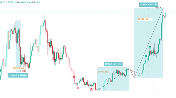 比特币昨日行情没有太大的变化,基本有在按照我们的预期波动。分享一下对于大周期上的看法:本轮牛市在周线上我认为会走三段式上涨,因为从波浪角度上讲的话一段完整的上涨周期都会分为三段式上涨。如图,首段上涨是从15443上涨到32000附近,随后向下回调到25000附近,再开启第二段上涨到最高价73800,。我们可以看到第二段式上涨的涨幅达到200%,并且目前为止并没有出现比较大的回调。在牛市当中是否会存在向下大幅度回调?答案是一定有的,但这个回调比例并不一定会像前一轮牛市一样腰斩跌幅三万多点,没有必要完全去参考前一轮牛市走势。当前位置我认为以横代跌企稳在高位的概率要高一点。