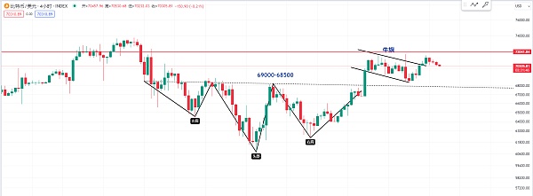 那我认为就这两天的几个高点一直都突破不上去 大约就是在72000附近还是有一个压力区 那么在69000到68500的这个区间如果是一个头肩底的形态在这个位置盘整 那么价格就不能又回到这个下方 如果回到了这个区间的下方 那么价格就会进一步下跌