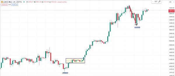 所以目前的这位置也是一样 因为他从高点跌下来到60000左右的低点 和上一次49000跌到了这个39000左右的低点 后面上来跟目前的这个位置的走势有一点相似 我认为短期在这个位置盘整就像在39000这边的盘整的区间 我们就要留意价格不能够回到盘整区间的下方