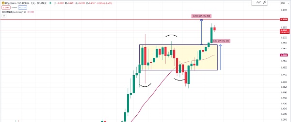 因为最近我在大部分的时候都在带大家做比特币和以太坊短线合约交易为主 那现在我们就要观察一下目前的这个箱体 按照之前的经验 箱体的突破之后 他就会复制这个箱体 就是等距的空间 有可能目标位就会在0.22附近 那现在价格已经是突破了这个0.22 目前我们就要思考是不是已经有效的站上了0.22