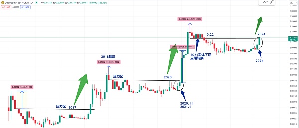 那么在下个月就会有可能大涨甚至是突破历史新高 因为我们可以同样观察一下狗狗币在2017年当时底部 也是连续两个月大长K线的上涨 或者是我们可以观察一下当时这个位置有一个压力区 包括这根K线的高点也是有一个压力区 他在这个位置只要突破了前面熊市的压力区