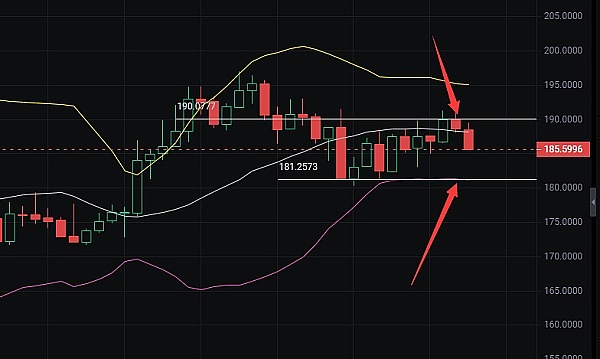 SOL对比BNB的话就相对弱势很多,1小时线来看截然不同,布林带通道处于平行状态,币价处于中轨下方位置,刚好是在半小时布林带下轨位置反弹,那么就要看半小时MACD能量是否能够缩量成功,KDJ如果能够脱离超卖区,那么币价会再一步进行拉伸;那么再回到1小时线来看,MACD能量如果持续向下持量成功,那么就要考虑币价会接近下轨184位置;再看4小时布林通道平行了很久,币价一直在中轨上下摆动;KDJ交叉上行想要进入超买区未果有意向下拐头;MACD0轴下方能量继续增持,DIF背离DEA向下拐头;综合上述指标来看可以考虑高空为主,低多为辅进场,上方关注187-189区间不破接空,下方关注184破位就到181,破位181可以继续持有;不破则轻多即可;行情瞬息万变,请结合实时盘面变化在操作,建议带好止盈止损,把握好风控!