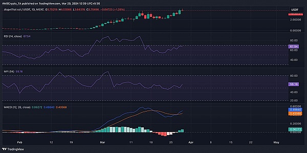 WIF 的移动平均线收敛分歧 (MACD) 数据证实了看涨趋势,该数据显示 MACD 线于 3 月 27 日越过信号线,开启了当前的牛市周期。