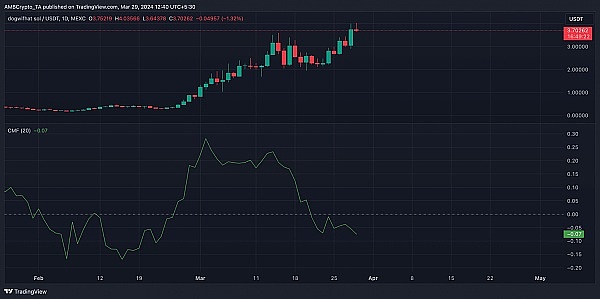 根据CoinMarketCap 的数据,基于 Solana 的 meme 代币Dogwifhat [WIF]的交易价格在 3 月 29 日短暂高于 4 美元,创下历史新高。截至发稿时,memecoin 的价格为每 WIF 3.68 美元,此后价格调整了 7%。