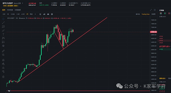 BTC目前处于一个短线的高点震荡,走势上没有得到更大的突破,一直在冲击72000点的短线阻力点位,按照目前的走势,个人觉得迟早会进行破位达到历史新高,按照目前的市场行情环境作为一个理解,70000点站稳之后震荡,慢慢的走向更高,第一步就是先去达到历史新高突破74000点,按照目前的百分比来计算,也就是前期预计的点位,这波行情可以先看76000-80000区间,这个位置一定要注意,尤其是合约方面注意插针表现