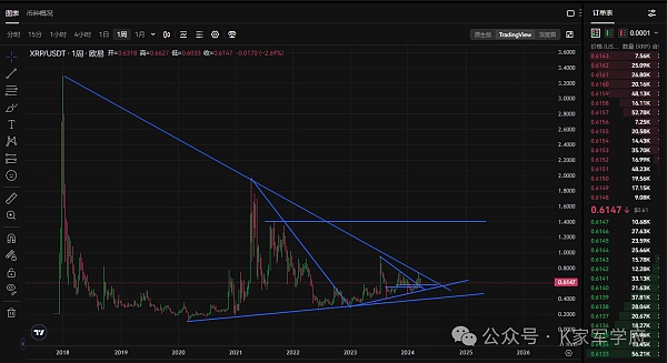 XRP属于市值比较大的主流币,也是一个老乌龟,但是按照目前周线级别的走势上来看明显的一个底部行情,只要走出目前的下行通道,后续的爆发力度是非常强势的,按照现在的报价0.61附近,往上看,短期一倍是没有问题的,长期来看的话几倍的空间也是有的