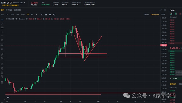 ETH目前走势表现一直都是弱势的行情,但是在前期高点4100点回踩1000美金的情况下,目前是站稳3000-3200区间位置,后续就看走势形成一个M顶还是直接走向一个单边的上涨趋势走出一个斜边的N字状态,上周直播的时候讲过,我更倾向于走出一个斜边的N字形态,那么这轮就会走向更高点突破前期新高,直接奔向目前的一个短线级别的目标点位4200-4500点,能不能继续冲高走向一个历史新高的行情就得看整体的量能的变化