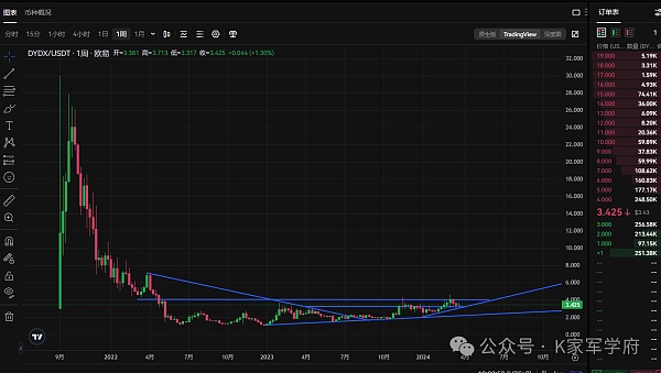 DYDX不用强调了,去中心话交易所,到那时今年以及去年的表现比较差,一直都是有解锁状态,但是也没有很大的跌幅,也没有什么战斧骨,目前的阻力点位4.5一直没有进行短线的突破,但是作为去中心交易所不是龙头币,属于一个价值币来讲,现在的价格就是一个白菜价,前期在2.0-2.6区间一直推荐到现在,虽然没有涨幅很大,但是我认为在底部阶段只要后续空间打开不说能赚多少,至少几倍的空间是有的,按照现在的价格3.4来看,未来10美金是肯定可以看见的,主要是能拿到那个时间,尤其是要拿住手中的筹码不要轻易的抛售