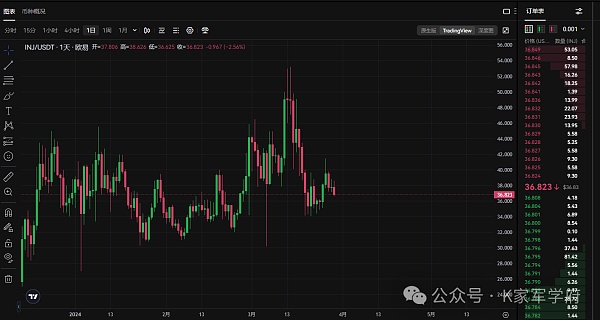 INJ就不多说了,目前的价格比较合适,个人觉得可以直接冲就完事,不要搞合约,现在的行情现货埋伏就是最好的机会,INJ现在的防守重点位置在30美金,现在的报价在36附近,是可以先入手头仓的,一点问题没有