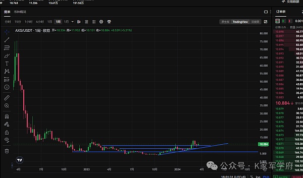 AXS属于炼油的龙头币,曾经的王者,现在虽然落魄了,但是我认为在目前的市场环境中埋伏一手不会有错,而且按照目前的周线级别来讲也是属于一个底部的阶段,前期触及一个双顶回踩,但是在8美金附近成功的支撑,很多人看我直播就知道,在8美金的时候让大家重仓进场,现在的价格在11附近,我个人觉得是可以上看一倍以上的,只要后续冲破25美金,上方的空间无限放大,可以直接看到40甚至更高