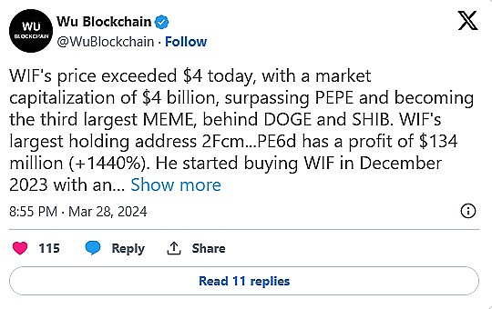 这一里程碑目前使WIF在迷因币排名中仅落后于柴犬币(SHIB)和狗狗币(DOGE)。相反,WIF现在的排名领先于其他基于模因的加密货币,如Pepe (Pepe)和Floki (Floki),这二者的价值分别为32.5亿美元和23.5亿美元。