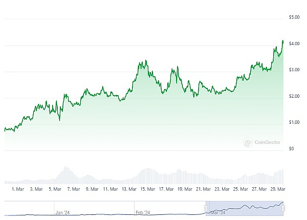 备受欢迎的索拉纳(Solona)迷因币WIF继续其令人印象深刻的反弹,其价格在今天(3月29日)早些时候飙升至4美元左右。在今天的大幅上涨之后,该代币的市值达到了惊人的40亿美元。