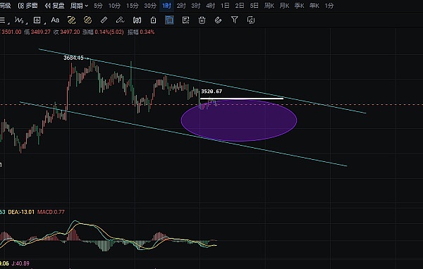 以太坊。昨日全天震荡走弱,连日多次突破3600后筹码量能有所转换,昨日实盘吃空短线也有所了结,场外实在精力有限间断停更。目前小时图来看,BOLL通道弱势向下开口,昨日欧盘、美盘两根阶梯大阴反复给到吞没探低信号,短期币价反复承压中轨下方运行,附图方面伴随龙头大饼的稳固,短线虽偏修补,但结构上低点陆续给到下挫试探,趋势上依旧偏空,今日操作上,李隆建议逢高大胆空,进场切记做好分批风控计划。
