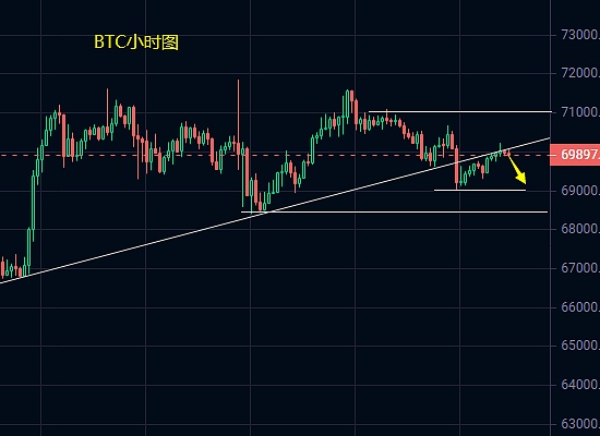 比特币,日线高位震荡调整明显,尤其71200上方的阻力压制,阻碍了多头破位上行,周初短线形成的良好反弹势能戛然而止,同时日线本有望在大幅回调之后的二次反弹也变得不确定;不过目前依然处于多空博弈之中,区间69000-71000,就看日线会在顶底位置率先往哪个方向破位(注意短线的跌破及突破不能构成判断依据,重点要看日线的收线);短线,昨日71000承压回落收阴,日线高位阴阳交替,凌晨回踩69000后反弹,近几日币价也一直处于此区间反复震荡,日内的话,将依托此区间高估低渣,破位前不去追。