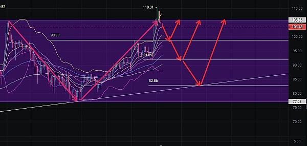 莱特币昨日文章有提到下方关注90.35不破可接多,恭喜多单上车的币友,行情在午后插针91位置迅速反弹,拉伸到今日间110处形成回调;从1小时线来看,布林通道收口,币价处于中轨下方EMA7和EMA15交叉压力位下;KDJ值即在20位置交叉未果向下发散,MACD0轴下方能量保持放量平衡;4小时来看,币价在冲高布林带上轨后回落EMA7处支撑,再看KDJ值已经小于80,即将形成交叉向下,MACD缩量下行,DIF顶部拐头向下,如若接近DEA形成了死叉转态,那么币价将会有一个较大的回调区间,反之在DEA值位置反弹继续向上,那么币价将会是一个新的突破,综合上述指标来看,短期内还是以高空为主,回调不破再考虑多单进场,建议上方关注104.5-105.5区间不破空;下方关注第一支撑位98.9,第二支撑位91.9;行情瞬息万变,文章审核有延迟,请结合实时盘面变化在操作,建议带好止盈止损,把握好风控!