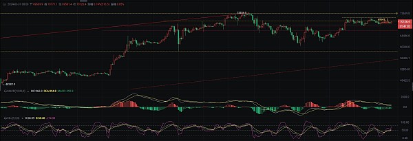 比特币昨日行情算是没有作妖,高位横盘,在七万关口附近走来回,(估计主力周末休息出去搞团建了)开个玩笑,来看今日盘口,截止发稿前比特币现价70100附近,早上八点开盘以后从69500附近拉伸了五百点,