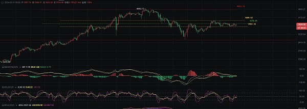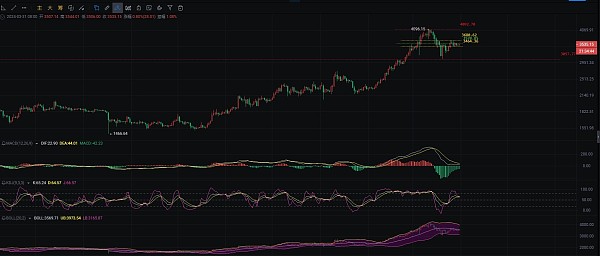 截止发稿前3535附近,日K线连续两日收阴,空头情绪浓厚,多头不要久拿,自由落地啊,EMA趋势指标只有10和15开始重合3520区间,EMA30有强力支撑可以关注3480关键点,MACD缩量上行,主力一直在增筹,KDJ向下交替成型趋势明显,布林带向下低头,空势比多头强一些,布林带中轨向下压力位关注3570关键点,