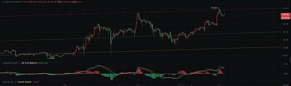 具体思路延续早期思路多头不变,105止盈出了一半,还剩一半等下一波拉伸,分批出来即可,止盈120.55和150整数关口,周期有点长,耐心持有,短线思路有回调,关注下方支撑点95.65和85.55两个位置,具体操作以盘口实时数据为主,后续会持续更新莱特的走势,安静等待行情的到来即可,具体操作以盘口实时数据为主更多资讯详情可以资讯笔者,文章发布有延迟,建议仅供参考风险自担