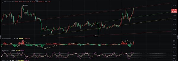 来看今日莱特的走势,截止发稿前莱特103附近,整体趋势呈现冲高回落状态,EMA趋势指标都在往上拉伸为K线提供新的支撑点,预计会拉伸到100整数关口横盘,MACD主力放量上行但是没有增筹,需要注意,DIF和DEA向上扩散受阻110.5,KDJ向下收口,空势指标有可能随时出现,注意防范,布林带开口以后K线回到了布林带通道内部,上方承压106.65,下方空间打开了缺口关注95.55支撑点