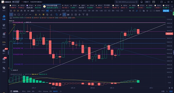4小时线:行情震荡反弹并未突破上方高点3680附近的压制回踩,从技术指标上看,行情反弹冲击上轨失利回踩,MACD也有缩量的走势,其他技术指标有拐头向下的走势,整体有跌破下方上涨趋势线支撑的趋势,下方可关注到斐波那契回撤线0.618处3600附近的支撑,跌破则有机会去测试中轨3555附近支撑,今天操作上长路建议先看行情回调下跌,不破下方支撑再考虑多单进场。