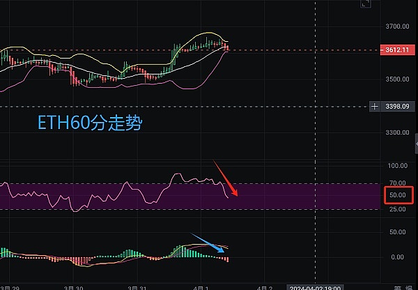 极短周期60分走势中,布林带三轨到收缩,买卖强弱指标趋势线RSI当前击穿中轴50,MACD快线下穿平均移动周期线。极短周期走势价格有下行3600可能。