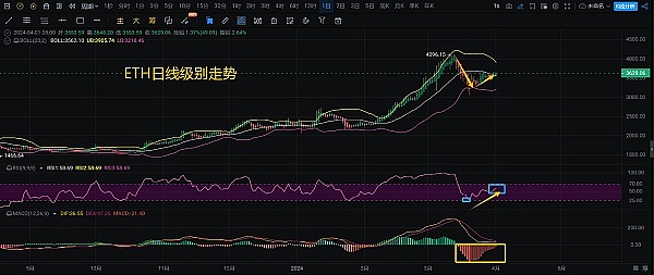ETH日线级别走势,价格在布林带中轨线上方,RSI指标趋势线突破中轴50值,走势上有冲高预期的技术支持。MACD方面快线底部反转上行至平均周期线相交。0轴下方空头量柱逐步萎缩。后续震荡上行走势强烈