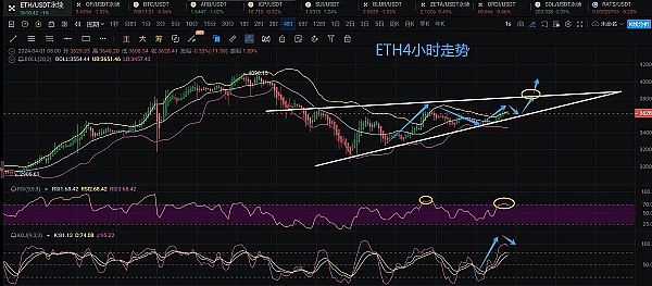 当前4小时ETH走势中,K线形态形成上升三角构造。底部反弹点位逐步抬高,冲破上升轨道压力后,价格持续冲高3900附近可能还是很大的。