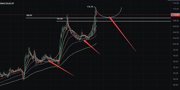 莱特币昨日文章布局有提到建议下方第一在102..7-101.4做多位置,第二做多建议在104.9-105.2破位后进场;币价果然如指标如期而至;当前价格在冲高112后回调震荡,那么在1小时线来看从27号到30号走了一个U型过度,从30到今日又走了一个U型过渡,那么本轮行情将还会走一个U型过渡吗?从目前的盘面数据来看,1-4小时线都是多头优势;尤其是在日线级别MACD已经有6根大放量柱,量值在3.72位置,再对比上一轮的柱体最高值在4.79,DIF也在接近上轮高点6.52位置,那么要是突破的话币价定会有一个较大的提升空间;当然行情也不会单边直线上涨,建议在回调进行低多布局;下方关注108.9-107.8区间不破多,上方看到115.5-117.5区间破位可继续持有;空单可考虑上方不破再结合实时盘口变化进行布局;行情瞬息万变,文章审核有延迟,请结合实时盘面变化在操作,建议带好止盈止损,把握好风控!