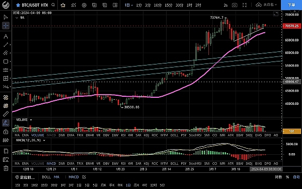 大饼周末两天波动不大,昨日白盘最低跌至69550一线支撑,随后行情一路震荡上行,最高触及71360一线受阻,恭喜跟上低多的朋友,目前币价在70780附近运行,四小时级别行情多次冲高都没能突破,高点逐步降低,屡屡承压走出回落,同样回踩低点也在逐渐抬高,形成三角区间震荡,短期行情重新回到ma7上方运行,若四小时能守住70500支撑预计还会上行测试前高,日线没什么太大变化依旧是区间震荡,69000-71700不破短线高空低多操作,长线思路不变,上方压制71500-72500,下方支撑70500-70000