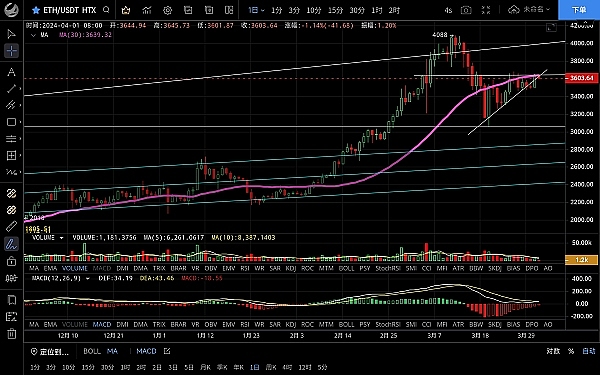 以太坊这两日走势稍强,昨日白盘连阳反弹直线拉升后受阻回落但力度不大,随后行情延续上行至3654一线,恭喜跟上低多思路的朋友,目前币价在3610附近运行,四小时级别行情直线拉升突破多个均线压制站上ma7上方,在前高附近受阻回落,短期多头缩量偏向下行,若收线在ma7下方且没有下影预计还会延续下行,关注3560附近支撑情况,日线整体还是被ma30均线压制,空间逐渐变窄,macd缩量运行双线粘合有金叉迹象,目前走势来看在大饼横盘的情况下以太坊有望走出补涨,短线先看回踩关注力度逢低做多为主,上方压制3640-3680,下方支撑3560-3500