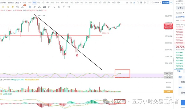 BTC四小时级别skdj在80上方还是双线缠绕,macd也是接近0轴附近,这两天很有可能要变盘 上方71900美元的位置很关键大家注意