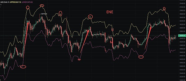 ENE指标通过这三条线的相对位置来判断价格走势。历辉认为当价格位于上轨线之上,并且上轨线向上倾斜时,说明市场处于上升趋势,此时上轨线可以看作是压力线。相反,当价格位于下轨线之下,并且下轨线向下倾斜时,说明市场处于下降趋势,此时下轨线可以看作是支撑线。