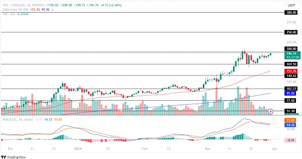 SOL在3月份一直都在积极的上涨,在上个月他的涨幅达到了54%以上。另外从今年的年初到目前为止的涨幅大约是95%,从而也凸显了SOL长期的购买力非常的强盛。
