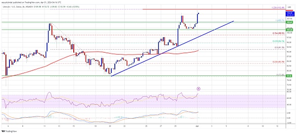 反之,如果莱特币的价格未能突破105美元的阻力位,则可能会出现下跌盘整。下方的初步支撑位在105 美元附近。