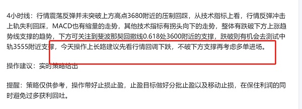 昨天长路在文中给出的先看行情的回踩,关注下跌趋势线3600的附近的支撑,跌破可看3555附近,实时策略中也给出了相应的对空测试,跟上操作的朋友,多空都有收获。